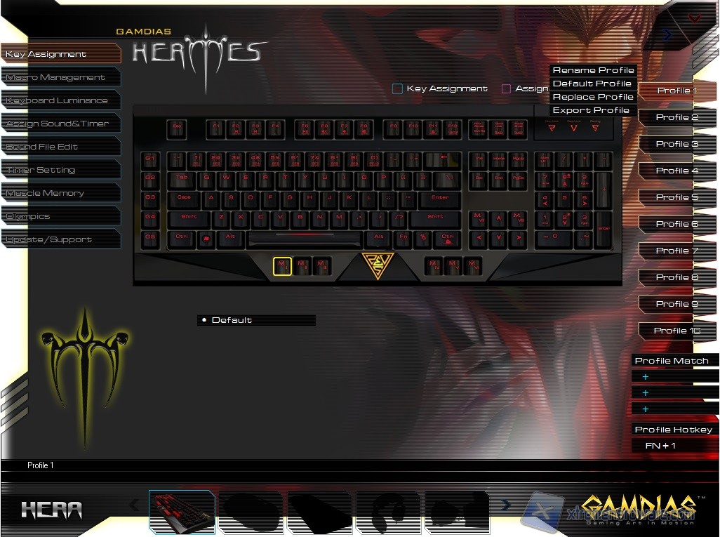 Il primo Menù è “Key Assignment” dove avremo modo di configurare un qualsiasi tasto per eseguire una macro o un cambio profilo o settare un tasto multimediale o ancora avviare ad esempio Skype e così via. Tramite il processore 32-bit ARM integrato in questa tastiera avremo modo di eseguire qualsiasi azione e di personalizzare in modo completo la tastiera secondo i nostri utilizzi. La completezza di questo primo Menù è ai massimi livelli e non abbiamo nulla da dire se non studiarvela per bene in quanto sono davvero tante le operazioni che possiamo eseguire. Inoltre, il software di gestione permette con estrema semplicità di creare 10 profili e di personalizzarli in ogni momento. Ricordiamo che i profili verranno salvati immediatamente nella memoria On-Board da 512KB. I profili possono essere rinominati, messi di default, esportati o sostituiti.